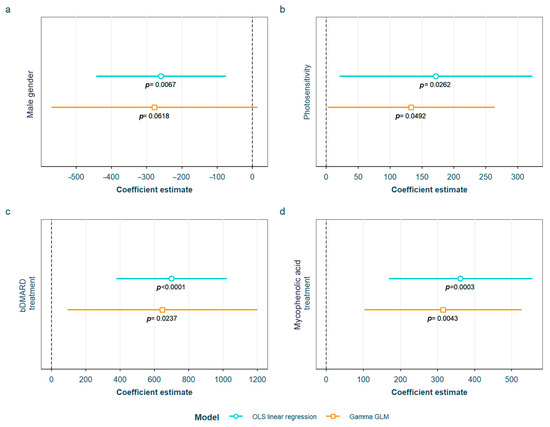Statistically significant associations between the serum receptor for advanced glycation end products and different systemic lupus erythematosus characteristics: (a) male gender; (b) having ever had photosensitivity; (c) current treatment with bDMARD; (d) current treatment with mycophenolic acid OLS: ordinary least squares; GLM: generalized linear model; bDMARD: biological disease-modifying antirheumatic drugs.