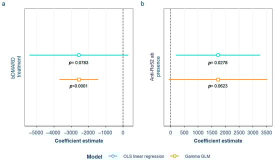 Statistically significant associations between pentosidine/sRAGE and different systemic lupus erythematosus characteristics: (a) current treatment with bDMARD; (b) positive anti-Ro52 antibodies sRAGE: soluble receptor for advanced glycation end products; OLS: ordinary least squares; GLM: generalized linear model. bDMARD: biological disease-modifying antirheumatic drugs.