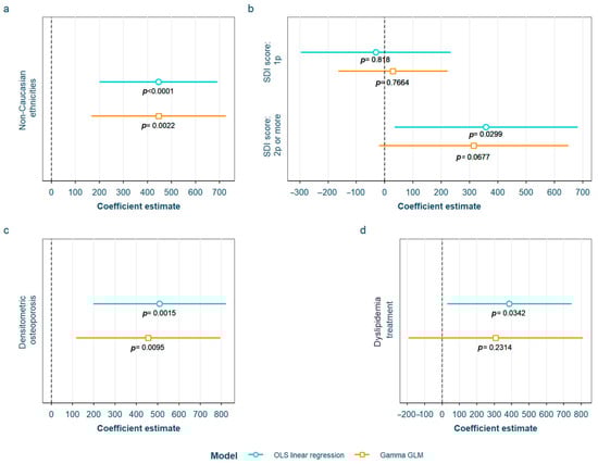 Statistically significant associations between CML/sRAGE and different systemic lupus erythematosus characteristics: (a) non-Caucasian ethnicities; (b) SDI score; (c) densitometric osteroporosis; (d) dyslipidemia drugs treatment CML: Nξ-(carboxymethyl)lysine; sRAGE: soluble receptor for advanced glycation end products; OLS: ordinary least squares; GLM: generalized linear model. SDI: systemic lupus erythematosus damage index.