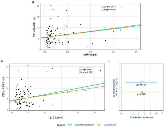 Statistically significant associations between CEL/sRAGE and different systemic lupus erythematosus characteristics: (a) CRP values, (b) IL-6 values; (c) pathological (>7 pg/mL) IL-6 values. CEL: Nξ-(carboxyethyl)lysine; sRAGE: soluble receptor for advanced glycation end products; OLS: ordinary least squares; GLM: generalized linear model. CRP: C-reactive protein; IL-6: interleukin 6.