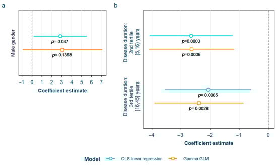 Statistically significant associations between skin AGEs/sRAGE and different systemic lupus erythematosus characteristics: (a) male gender; (b) disease duration in tertiles AGEs: advanced glycation end products; sRAGE: soluble receptor for advanced glycation end products OLS: ordinary least squares; GLM: generalized linear model.