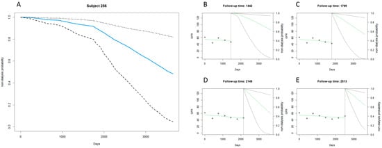 Stage 3a CKD example: late dialysis with the joint model. (A) Displays days since observation starts on the horizontal axis (0 to over 3000 days) and the probability of not undergoing dialysis on the vertical axis (0 to 1.0). The solid blue line represents the estimated probability of non-dialysis for case number 256, decreasing over time. Dashed black lines show the 95% confidence interval, widening over time to indicate increasing uncertainty in long-term forecasts. (B–E) Mark follow-up time at the top, with the solid green line for predicted GFR changes and dashed black lines for the 95% confidence interval of non-dialysis probability, indicating greater uncertainty over time. Asterisks (*) denote actual observed GFR values.