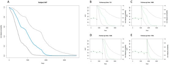 Stage 3a CKD example: early dialysis with the joint model. (A) Displays days since observation starts on the horizontal axis (0 to over 3000 days) and the probability of not undergoing dialysis on the vertical axis (0 to 1.0). The solid blue line represents the estimated probability of non-dialysis for case number 647, decreasing over time. Dashed black lines show the 95% confidence interval, widening over time to indicate increasing uncertainty in long-term forecasts. (B–E) Mark follow-up time at the top, with the solid green line for predicted GFR changes and dashed black lines for the 95% confidence interval of non-dialysis probability, indicating greater uncertainty over time. Asterisks (*) denote actual observed GFR values.