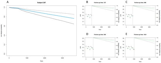 Stage 3b–5 CKD example: late dialysis with the joint model. (A) Displays days since observation starts on the horizontal axis (0 to over 3000 days) and the probability of not undergoing dialysis on the vertical axis (0 to 1.0). The solid blue line represents the estimated probability of non-dialysis for case number 207, decreasing over time. Dashed black lines show the 95% confidence interval, widening over time to indicate increasing uncertainty in long-term forecasts. (B–E) Mark follow-up time at the top, with the solid green line for predicted GFR changes and dashed black lines for the 95% confidence interval of non-dialysis probability, indicating greater uncertainty over time. Asterisks (*) denote actual observed GFR values.