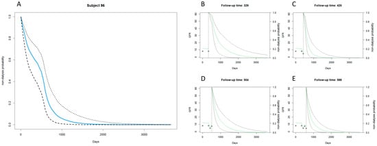Stage 3b–5 CKD example: early dialysis with the joint model. (A) Displays days since observation starts on the horizontal axis (0 to over 3000 days) and the probability of not undergoing dialysis on the vertical axis (0 to 1.0). The solid blue line represents the estimated probability of non-dialysis for case number 96, decreasing over time. Dashed black lines show the 95% confidence interval, widening over time to indicate increasing uncertainty in long-term forecasts. (B–E) Mark follow-up time at the top, with the solid green line for predicted GFR changes and dashed black lines for the 95% confidence interval of non-dialysis probability, indicating greater uncertainty over time. Asterisks (*) denote actual observed GFR values.