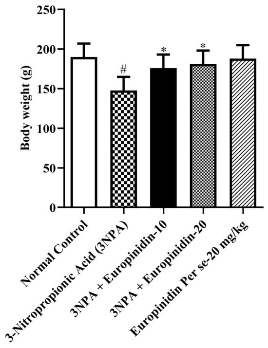 The effect of europinidin on body weight. Mean ± 95% CI. (n = 6). # p < 0.0001 vs. Normal control, * p < 0.05 vs. 3-NPA control. One-way ANOVA following Tukey’s test.
