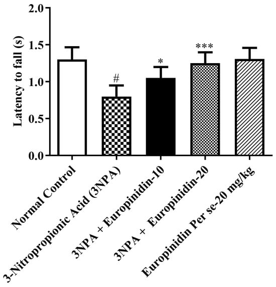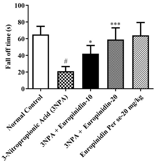 The effect of europinidin on the rotarod test. Mean ± 95% CI. (n = 6). # p < 0.0001 vs. Normal control, * p < 0.05, *** p < 0.0001 vs. 3-NPA control. One-way ANOVA following Tukey’s test.