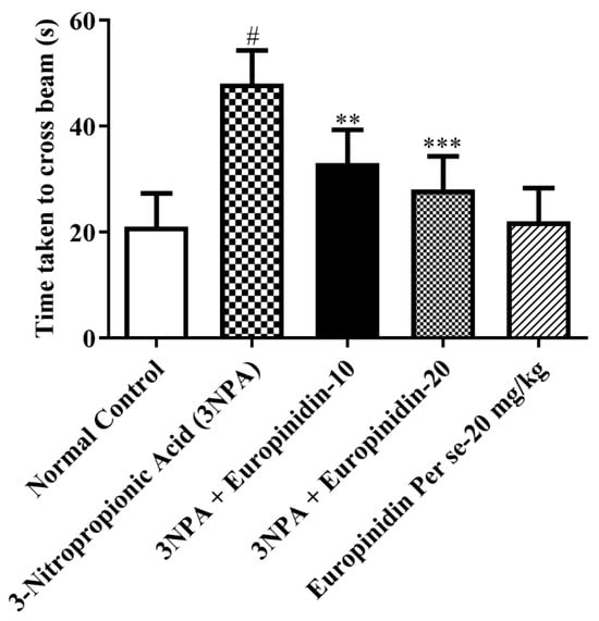 The effect of europinidin on the beam-walk test. Mean ± 95% CI. (n = 6). # p < 0.0001 vs. Normal control, ** p < 0.001, *** p < 0.0001 vs. 3-NPA control. One-way ANOVA following Tukey’s test.
