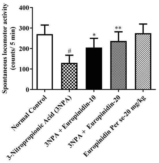 The effect of europinidin on spontaneous locomotor activity. Mean ± 95% CI. (n = 6). # p < 0.0001 vs. Normal control, * p < 0.05, ** p < 0.001 vs. 3-NPA control. One-way ANOVA following Tukey’s test.