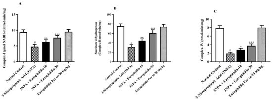 (A–C): The effect of europinidin on (A) Mitochondrial complex-I, (B) Mitochondrial complex-II, and (C) Mitochondrial complex-IV. Mean ± 95% CI. (n = 6). # p < 0.0001 vs. Normal control, * p < 0.05, ** p < 0.001, *** p < 0.0001 vs. 3-NPA control. One-way ANOVA following Tukey’s test.