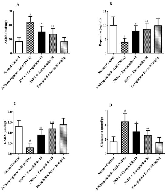(A–D): The effect of europinidin on (A) AChE, (B) Dopamine, (C) GABA, and (D) Glutamate. Mean ± 95% CI. (n = 6). # p < 0.0001 vs. Normal control, * p < 0.05, ** p < 0.001, *** p < 0.0001 vs. 3-NPA control. One-way ANOVA following Tukey’s test.