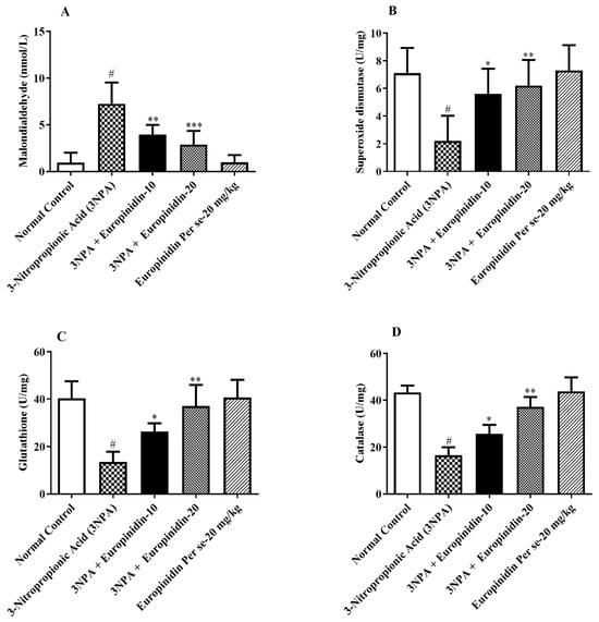 (A–D): The effect of europinidin on (A) MDA, (B) SOD, (C) GSH, and (D) CAT. Mean ± 95% CI. (n = 6). # p < 0.0001 vs. Normal control, * p < 0.05, ** p < 0.001, *** p < 0.0001 vs. 3-NPA control. One-way ANOVA following Tukey’s test.
