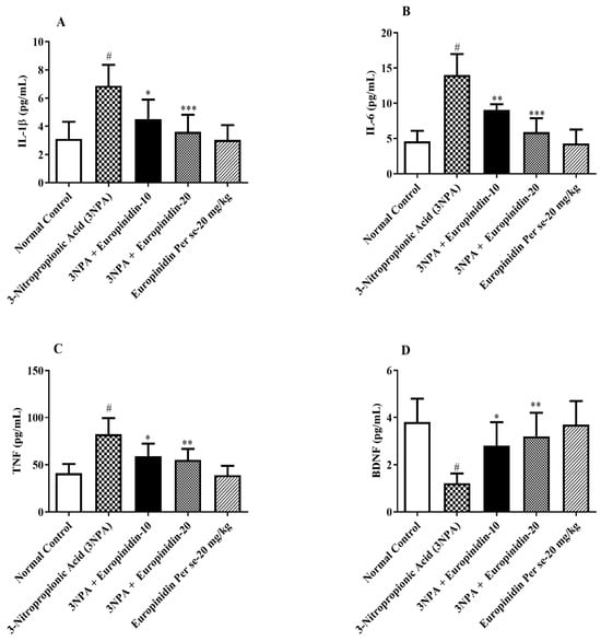 (A–D): The effect of europinidin on (A) IL-1β, (B) IL-6, (C) TNF-α, and (D) BDNF. Mean ± 95% CI. (n = 6). # p < 0.0001 vs. Normal control, * p < 0.05, ** p < 0.001, *** p < 0.0001 vs. 3-NPA control. One-way ANOVA following Tukey’s test.