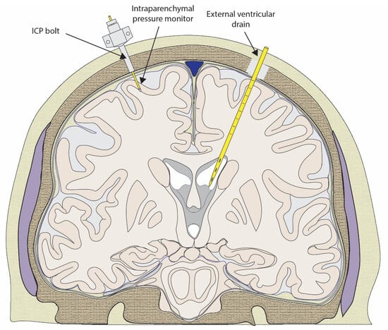 Schematic diagram of a coronal section of the head with an intraparenchymal pressure monitor (with bolt) and external ventricular drain in situ. Both devices may be used to measure pressure from their respective compartments via a transducer.
