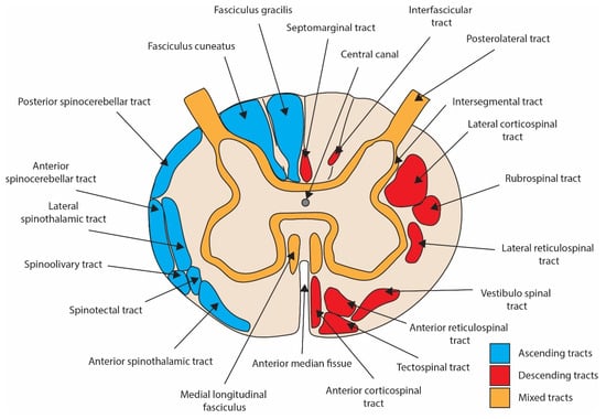The spinal cord is a complex structure, composed of grey matter (unmyelinated) and white matter (myelinated). Three columns can be recognised as structures of the cord, which run bilaterally in a rostro-caudal plane: the dorsal, ventral and lateral columns (Figure 2). Within these columns are more focal tracts, categorised as ascending (afferent/sensory), descending (efferent/motor) and mixed (Figure 2). SCI can be classified by spinal cord regions damaged/affected by the injury and may be complete (with all tracts affected) or incomplete (with some tracts preserved) [46,47,48]. The regions affected and corresponding clinical presentations of incomplete SCI syndromes are shown in Figure 3. Similarly, the variety of pre-clinical models for the study of traumatic SCI result in differing neurological deficits dependent on the anatomical location of the injury.
