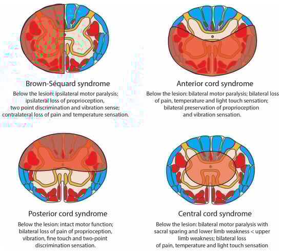 Schematic diagram of four classically described incomplete spinal cord injury syndromes with brief descriptions of their typically associated clinical features. Damaged regions are denoted in translucent red. Motor tracts = opaque red; sensory tracts = blue. Brown-Séquard syndrome (hemisection of the cord) can occur following trauma, particularly penetrating injuries, or from the expansion of tumours. Anterior cord syndrome can occur during trauma or ischaemia. Posterior cord syndrome typically follows posterior spinal artery occlusion. Central cord syndrome is a cervical SCI that can occur after a hyperextension injury with pre-existing cervical stenosis.