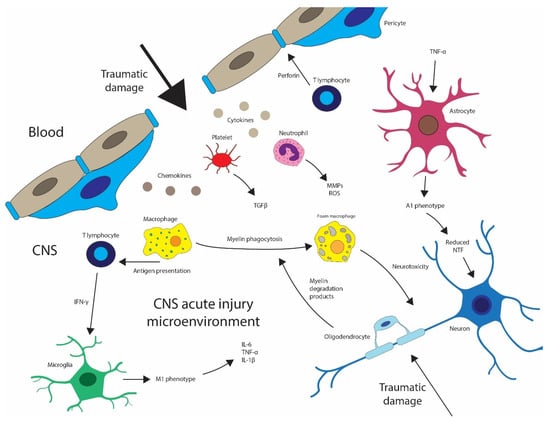 The presence of TGFβ and proinflammatory mediators activates the inflammatory cascade, directly and indirectly via chemokine release (activating migrated blood-derived immune cells (macrophages, neutrophils and lymphocytes) and resident glia (microglia and astrocytes)) (Figure 4). This activation potentiates the inflammatory response, releasing further TGFβ, as well as interleukins (ILs) (IL-1α/β, IL-2, IL-6 and IL-8 [71]) and epidermal growth factor (EGF) [70]. Local chemokines also result in tissue remodelling via upregulation of matrix metalloproteinases (MMPs) and plasminogen activator 1 (PA-1). Whilst the initial neuroinflammatory response is triggered during this acute phase, the immune response persists throughout these three phases [68]. To an extent, leucocyte activation is favourable in traumatic injury for the restoration of blood–CNS barrier integrity and wound sterilisation and debridement. Neutrophils sterilise the wound of foreign pathogens by phagocytosis, with further debridement and the release of inflammatory mediators, MMPs and ROS. Monocytes deposit extracellular matrix (ECM) and initiate angiogenesis via the release of vascular endothelial growth factor (VEGF). Macrophages and resident microglia have a multi-faceted role, with favourable effects (mitigating local excess neurotransmitters from necrotic release, tissue remodelling and growth factor release) and unfavourable effects (myelin phagocytosis, demyelination and astrogliosis).