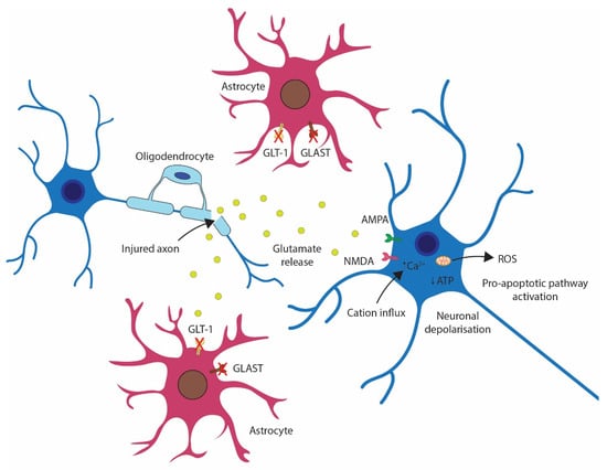 Excitotoxicity results from the increased and uncontrolled release of excitatory neurotransmitters after trauma, principally glutamate [16,68]. Glutamate release from damaged axons in the spinal cord and pre-synaptic terminals in the brain results in accumulation within the injury microenvironment [21], compounded later by impaired reuptake due to decreased astrocytic expression of glutamate transporters glutamate aspartate transporter (GLAST) and glutamate transporter (GLT)-1 [81]. Glutamate activates α-amino-3-hydroxy-5-methyl-4-isoxazolepropionic acid receptor (AMPA) and N-methyl-D-aspartic acid (NMDA) receptors, which permit influx of cations (K+, Na+, and Ca2+) and depolarisation, with excessive activation resulting in intracellular Ca2+ accumulation, compromising mitochondrial function [16], contributing to ROS production and activating apoptotic pathways. This process is illustrated in Figure 5.