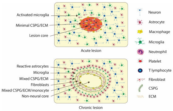 Consolidation of the glial scar during the chronic phase after injury creates a continual inhibitory environment for neurons attempting to regenerate severed axons. In SCI, cavitation, that is, fluid-filled cysts, expands over a period of months as inflammatory cells remove non-viable tissue, and an expanding zone of apoptosis, degeneration and demyelination occurs [106]. The acute and consolidation phases of glial scar formation are illustrated in Figure 7.