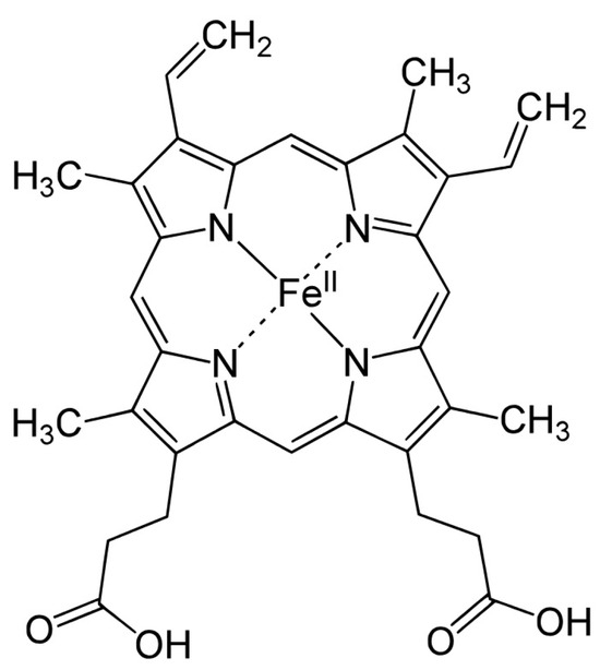 CYP enzymes contain between 400 and 500 amino acid residues and one heme prosthetic group in the active site, iron in protoporphyrin IX [17]. In this structure, four pyrrole rings (I–IV) are interconnected by methyl bridges α, β, γ, and δ. Iron in the trivalent (ferric, Fe3+) form is located in the center of the protoporphyrin ring (Figure 1) and is coordinated by pyrrolic nitrogen. In addition, a water molecule is bound to the iron in the native structure. The heme iron is bound to the apoprotein via the thiol group of the cysteine residue. These are also the places for potential CYP inactivation by a covalent heme modification, by the modification of the apoprotein or by forming a pseudo-irreversible complex with iron [18].