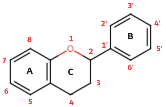 Flavonoids are a diverse group of plant pigments that exhibit a wide range of biological activities, making them of great interest to both scientists and the public alike. These naturally occurring compounds are found in a variety of fruits, vegetables, and beverages, and they are responsible for the vibrant colors of many plants [77]. The term flavonoids comes from the Latin word flavus, which means yellow; this refers to their characteristic of giving color to plants. The basic structure of flavonoids follows the polyphenolic concept; it consists of 15 carbon atoms that are connected to each other in a structure composed of three different rings (A, B, and C), of which two rings (A and B) are aromatic. The structure is connected in the form of a C6-C3-C6 group (Figure 2).
