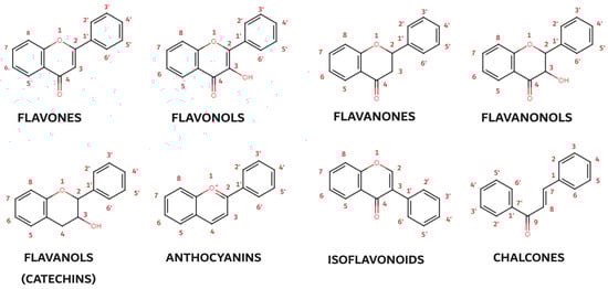 Of the three benzene rings of the basic structure of flavonoids, rings A and C are mutually condensed, while ring C is substituted with an oxygen atom in position 1 (chromane ring). A benzene ring (B) is attached to the C2 position of the chromane ring. Depending on the basic structure of flavonoids, different groups and subgroups of flavonoids can be classified. This further division is based on different substituents on the basic structure of flavonoids, as well as on the degrees of oxidation and saturation of certain subgroups of flavonoids [78]. Thus, the following subgroups are most often described in the available literature: flavones, flavonols, flavanones, flavanonols, flavanols (catechins), anthocyanins, isoflavonoids, and chalcones (Figure 3).