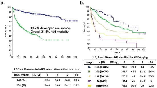 Long-term outcome of study cohort. (a) Disease-specific survival curve (blue line) and disease-free survival curve (green line) of 754 HCC patients. The 1-, 3-, 5-, and 10-year disease-specific survival was 98.4, 96.9, 96.0, and 89.5 months in no recurrence group and 90.6, 69.0, 58.2, and 35.2 months in recurrence patients, respectively (p < 0.001). (b) Disease-free survival curve stratified by AJCC staging (p < 0.001).