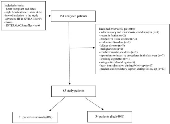 This was a prospective review of 154 patients with advanced HF underwent qualification for HT, who were hospitalized at our institution for right heart catheterization (RHC) between 2016 and 2017. All patients underwent a preliminary assessment according to the exclusion and inclusion criteria. A flow chart of the study design for the inclusion and exclusion criteria is presented in Figure 1.