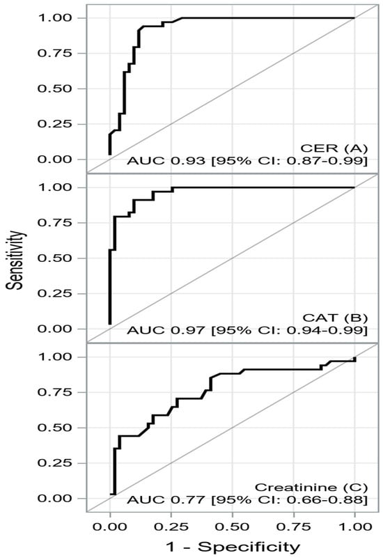 The ROC curves for CER (A), CAT (B), and creatinine (C). Abbreviations: AUC, area under the curve; CI, confidence interval.