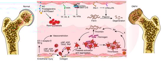 The pathological characteristic of osteonecrosis caused by vascular ischemia is significantly impacted by coagulopathy []. Inadequate fibrinolysis and excessive thrombophilia are the primary causes of this. Both acquired and hereditary thrombophilia/hypofibrinolysis can result in osteonecrosis of the femoral head and jaw at all ages [,]. Extreme thrombophilia, also known as hypercoagulability, is a coagulation disorder in which a great number of blood clots form on the walls of circulating blood vessels. Fibrinolysis is the decomposition of a thrombosis or clot, and it is tightly controlled by tissue factor plasminogen inhibitor (TFPI), plasminogen activators, plasminogen activator inhibitor-1 (PAI-1), and plasmin []. A healthy endothelium constitutes an anticoagulant and antithrombotic protective layer and secretes an abundance of substances that directly regulate platelet activity, including nitric oxide (NO), prostaglandins, and ectonucleoside triphosphate diphosphate hydrolase-1 (E-NTPDase1) [,]. Endothelial cells express TFPI, which limits the effects of tissue factor (TF) and inhibits the TF-mediated overactivation of clotting factors VII and X []. The surfaces of endothelial cells bind to antithrombin, which effectively inhibits platelet activity. Endothelial cells generate thrombomodulin (TM) which binds to thrombin, inducing an alteration in structure that increases its affinity for protein C/S and inhibits clotting factors Va and VIIIa []. In addition, endothelial-derived tissue plasminogen activator (t-PA) and urokinase-type plasminogen activator (u-PA) can interact with PAI-1 to switch plasminogen into plasmin, thereby facilitating the degradation of fibrin [].