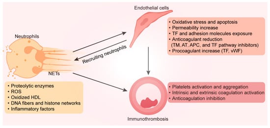 As the most plentiful white blood cells in the blood, neutrophils play an essential role in innate immunity []. Neutrophils typically have the lowest lifespan among white blood cells, which is critical for avoiding continued inflammation and tissue healing in patients with osteonecrosis []. A considerable portion of neutrophils depart from the bone marrow during inflammation. Accompanying this process are the secretion of inflammatory cytokines and molecules, the synthesis of reactive oxygen species, and the release of proteolytic enzymes []. Moreover, proinflammatory substances and other enzymes found in neutrophil extracellular traps (NETs), which are released by active neutrophils, cause endothelial dysfunction and apoptosis []. The externalization of extracellular matrix proteases during NET formation causes endothelial injury and glycocalyx shedding, which exposes adhesion receptors and TF, thereby stimulating platelet and leukocyte adhesion and further inflammation []. The ROS-generating enzymes NO synthase (NOS) and oxidized high-density lipoprotein are also expressed at high levels in NETs, where they reduce their ability to efflux cholesterol and prevent foam cell formation, which fosters plaque formation and coagulopathy []. Engelmann et al. evaluated the mechanisms of NET-mediated thrombosis and used the term “immunothrombosis” to describe this process []. By producing a cascade of favorable feedback that enhances thrombosis both in vivo and ex vivo, the scaffold formed by DNA fibers and histone networks in NETs attracts platelets, leukocytes, red blood cells, and plasma proteins []. Inflammation in injured endothelial cells results in a reaction secretion (e.g., adhesion molecules and pro-inflammatory factors) during the acute phase, which disseminates to the circulation []. Through interactions with vWF, extracellular DNA in NETs can intensify thrombosis and inflammatory processes []. NETs stimulate the intrinsic coagulation process and facilitate the connection among neutrophils with factor XII (FXII). TF expression and activity in endothelial cells can be increased by NETs, expanding the extrinsic coagulation pathway []. Moreover, endothelial-derived anticoagulants such as antithrombin (AT), activated protein C (APC), and TF pathway inhibitors are inhibited by NETs, which leads to thrombosis []. In patients with ONFH, the femoral head microvessels contain a considerable number of neutrophils and NETs []. Osteonecrosis was further promoted by the intravenous injection of neutrophils capable of forming NETs in rats []. Therefore, the efficient removal of activated neutrophils is a potential target for the treatment of osteonecrosis (Figure 2).