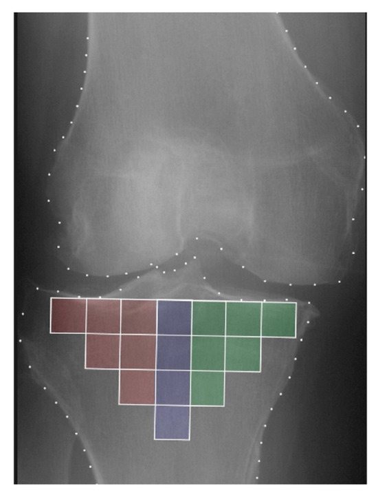 Illustration of the 16 regions of interest (ROIs) automatically selected, covering the entire tibial subchondral bone structure. Medial, central, and lateral ROIs are highlighted in green, blue, and red, respectively.