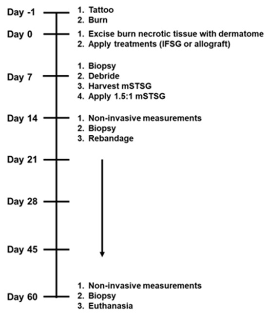Wound dressings were removed from anesthetized animals on day 7. Wounds were briefly debrided via a combination of wet debridement and the use of a curette. Prior to any grafting, a biopsy of each wound bed was harvested. STSGs were harvested from the hindlimbs at 0.010–0.012″ with the pneumatic dermatome and meshed at 1.5:1 or 3:1 with a Zimmer mesher. On each animal, two IFSG-treated wounds received a 1.5:1 meshed STSG (mSTSG), two IFSG-treated wounds received a 3:1 mSTSG + another piece of IFSG as a protective cover, and the allograft-treated wounds received a 1.5:1 mSTSG. Grafted wounds were covered with a bolster, dressings, and jacket as performed on day 0. Since the 3:1 mSTSG was only evaluated with an IFSG and not an allograft as a control, the data are presented as supplemental (Supplemental Figures S1 and S2 and Table S1).