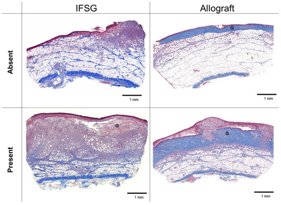 Mason’s trichrome histology at day 7 with granulation tissue formation. Representative images of biopsy punches harvested at the day-7 time point prior to skin graft application that align with the pathologist scoring of granulation tissue shown in Table 2. Black scale bars = 1 mm. @ = residual pieces of treatment in wound bed. IFSG = intact fish skin graft.
