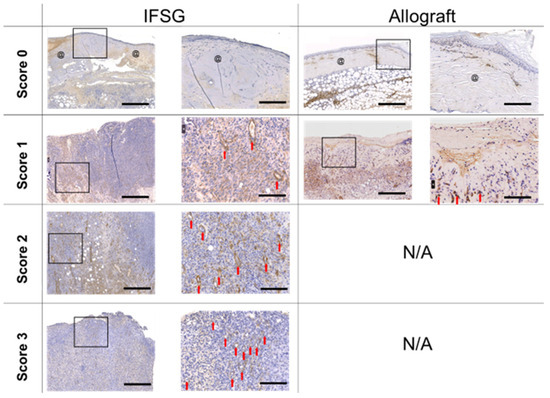 Day 7 alpha-smooth muscle actin staining. Representative images of slides stained with α-SMA that consist of wound bed samples collected prior to skin graft application on day 7. Sections are shown that align with the pathologist scoring listed in Table 2. No allograft-treated wounds scored a 2 or 3 and, hence, N/A is indicative of no wounds with those scores. Myofibroblasts and new blood vessels can be identified in the images by the positive brown staining. The left image of the biopsy punch has scale bars = 500 µm. The image on the right is the magnified black box region from the left image with scale bars = 125 µm. Residual pieces of product = @; new blood vessels = red arrow. IFSG = intact fish skin graft.