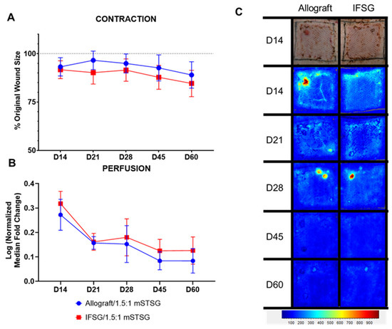 Contraction and laser speckle imaging. (A) Wound contraction was calculated by tracing the tattoos, compared to the initial wound size, and normalized to the growth of each animal. The wound size on day 0 is represented by the dotted line. If contraction occurred during healing, a decrease in the % original wound size would be observed. No significant differences comparing the groups at each time point were detected by 2-way repeated-measures ANOVA with Sidak’s post hoc test. (B) Laser speckle imaging was used to measure the perfusion in the wounds. A fold change was calculated by dividing the wound perfusion by the local background perfusion. The perfusion within the growth control regions was used for normalization for each time point. The normalized median fold change was log transformed in order to pass the Shapiro–Wilk normality test. No significant differences comparing the groups at each time point were detected using two-way repeated-measures ANOVA with Sidak’s post hoc test. The median with 95% confidence intervals is represented in the figure; N = 10 (IFSG); 12 (allograft). (C) One wound is depicted for each group throughout the study. A day-14 digital image is shown with the longitudinal LSI images. At the bottom is the heatmap scale that defines blue as low perfusion and red as high perfusion. Normal uninjured skins’ baseline perfusion is blue. By the day 60 end-point, the wound edges are no longer obvious, suggesting a return to normal perfusion levels. IFSG = intact fish skin graft.