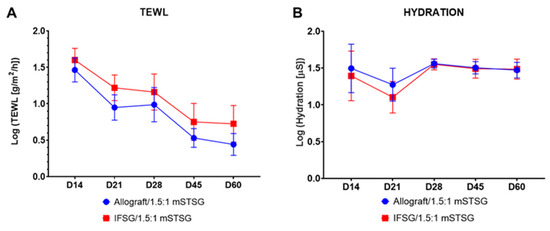 Barrier function of healing burn wounds. (A) The skin barrier function was measured by TEWL for all wounds. The mean TEWL measurement was obtained by averaging 3 spots from each wound per time point. The mean was log transformed in order to pass the Shapiro–Wilk normality test. No significant differences comparing the groups at each time point were detected by 2-way repeated-measures ANOVA with Sidak’s post hoc test. (B) Hydration measures the water content of the wounds. Hydration values of 5 spots within each wound were averaged. The mean was log transformed in order to pass the Shapiro–Wilk normality test. No significant differences comparing the groups at each time point were detected by 2-way repeated-measures ANOVA with Sidak’s post hoc test. Results are shown as mean with 95% confidence intervals; N = 10 (IFSG); 12 (allograft). IFSG = intact fish skin graft.