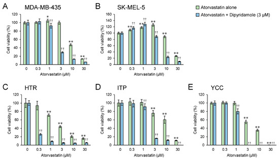 Enhancement of the growth inhibitory effect of atorvastatin on tumor cell lines by combination treatment with dipyridamole. Relative growth of human MDA-MB-435 (A) and SK-MEL-5 (B) and canine HTR (C), ITP (D), and YCC (E) melanoma cell lines is shown. Green and blue bars represent atorvastatin single treatment group and atorvastatin–dipyridamole combination treatment group, respectively. Values in DMSO control were set at 100%. Each value represents the mean ± SD (n = 3). Data were analyzed using a one-way analysis of variance (ANOVA) with Dunnett’s test for multiple group comparisons. * p < 0.05, ** p < 0.01, †† p < 0.01 with respect to each control group.