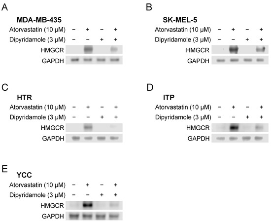 The cells were seeded in 6-well plates and cultured until reaching subconfluence. Protein was extracted after 24 h of the addition of 10 µM atorvastatin, 3 µM dipyridamole, the drug combination, or 0.2% DMSO.