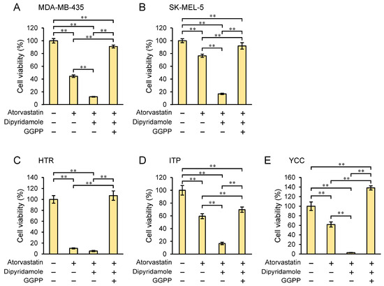 The addition of GGPP attenuated the inhibitory effect of atorvastatin–dipyridamole co-treatment and significantly rescued (p < 0.01) cell proliferation in all cell lines examined: SK-MEL-5 and MDA-MB-435 (human melanoma), and YCC, ITP, and HTR (canine melanoma) (Figure 3). This also demonstrates that the decrease in the melanoma cell line viability by the statin–dipyridamole co-treatment is an on-target (i.e., HMGCR) effect on the mevalonate pathway.