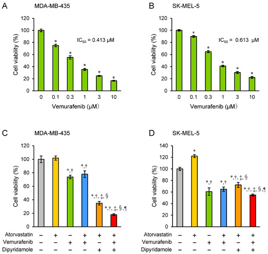 The MDA-MB-435 and SK-MEL-5 melanoma cells lines are known to harbor BRAF Val600Glu (V600E) mutations and to be sensitive to the BRAF inhibitor vemurafenib [25,26]. Indeed, vemurafenib treatment inhibited cell proliferation in a dose-dependent manner 72 h after the start of drug addition (Figure 4A,B). When used alone at a concentration that exhibited a 20–30% cytostatic effect on cell growth of the two human melanoma cell lines, vemurafenib did not augment the inhibitory effect on cell proliferation with atorvastatin alone, but it did so in the presence of atorvastatin and dipyridamole co-treatment (Figure 4C,D).