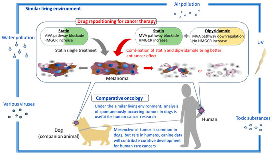 Melanomas occur not only in humans, but also in many animals, including dogs, cats, horses, and pigs; however, they are more common in dogs than in other species [46]. Domestic dogs (Canis lupus familiaris) spontaneously develop melanoma and are exposed to environmental factors similar to those experienced by humans; they have a physiology similar to that of humans, indicating that dogs are excellent animal models for the development of novel therapies for melanoma [47]. Thus, comparative oncology, which compares humans with companion animals living in similar or shared environments, can provide useful insights into developmental mechanisms and treatments of human melanoma. Several studies, including ours, have shown that statins exert anticancer effects on canine tumors [16,48,49,50]. Furthermore, atorvastatin is well tolerated and has no apparent adverse effects or biochemical abnormalities in either healthy dogs or dogs with congestive heart failure [51]. Therefore, statins are considered suitable for cancer treatment in dogs. In addition, dipyridamole is more cytotoxic toward cancer cells than normal cells [52]. Given the lack of effective therapies for melanoma in dogs [47], statin–dipyridamole combination therapy may be a good treatment option, and the outcome from therapy in canines can be used as a reference for human melanoma treatment (Figure 5).