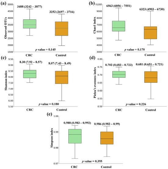 Alpha diversity comparison between feces from colorectal cancer (CRC) patients and controls. (a) Observed OTUs; (b) Chao1 index; (c) Shannon index; (d) Pielou’s evenness index; (e) Simpson index. Median values with interquartile range and p values are indicated.