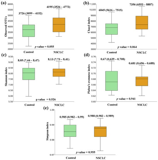 Alpha diversity comparison between feces from non-small cell lung cancer (NSCLC) patients and controls. (a) Observed OTUs; (b) Chao1 index; (c) Shannon index; (d) Pielou’s evenness index; (e) Simpson index. Median values with interquartile range and p values are indicated.