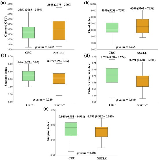 Alpha diversity comparison between feces from colorectal cancer (CRC) and non-small cell lung cancer (NSCLC) patients. (a) Observed OTUs; (b) Chao1 index; (c) Shannon index; (d) Pielou’s evenness index; (e) Simpson index. Median values with interquartile range and p values are indicated.