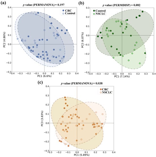 With respect to beta diversity, no significant differences between CRC or NSCLC patients and controls were detected, although in the NSCLC vs. controls comparison differences bordered statistical significance (in PERMDISP test, p value = 0.082 for the Jaccard index). However, when feces from the CRC and NSCLC patients were compared, differences in beta diversity became remarkable (in PERMANOVA test, p value = 0.010 for Bray–Curtis, and p value = 0.038 for the Jaccard index). Figure 4 shows bidimensional PCoA plots and p values for Jaccard beta diversity index between the study populations: CRC vs. control (Figure 4a), NSCLC vs. control (Figure 4b) and CRC vs. NSCLC (Figure 4c).