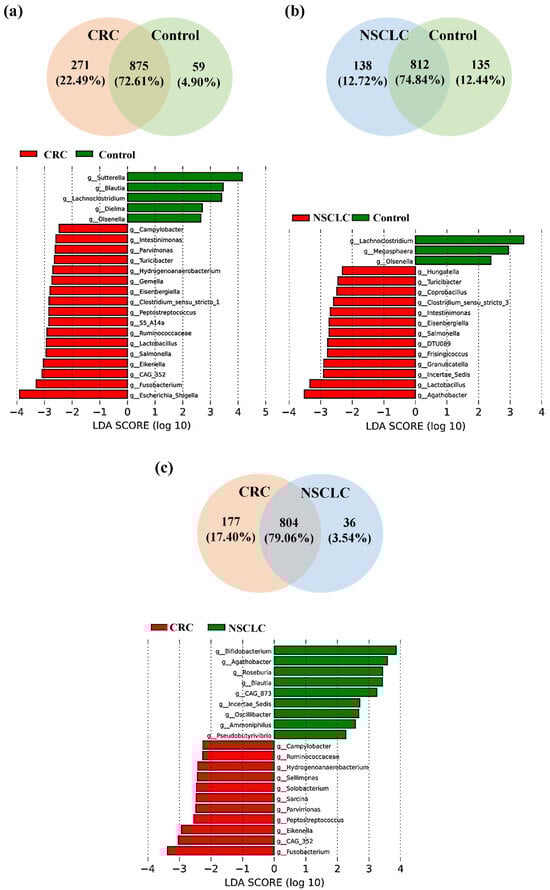 Taxonomic comparison at the bacterial genus level between feces from colorectal cancer (CRC) patients, non-small cell lung cancer (NSCLC) patients and controls (Venn diagrams and LEfSe analysis). (a) CRC vs. controls; (b) NSCLC vs. controls; (c) CRC vs. NSCLC.