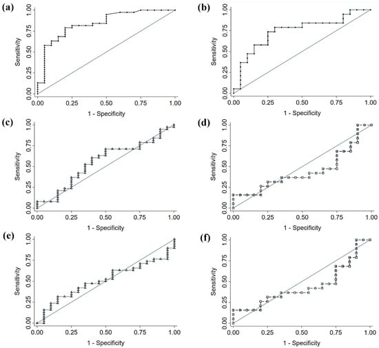 Receiver operating characteristic (ROC) curves of diagnostic accuracy of fecal microbiota signatures applied to our study population. (a) Proposed colorectal cancer (CRC) signature; (b) proposed non-small cell lung cancer (NSCLC) signature; (c,d) signature proposed by Thomas et al. [] applied to CRC and NSCLC, respectively; (e,f) signature proposed by Yang et al. [] applied to CRC and NSCLC, respectively.