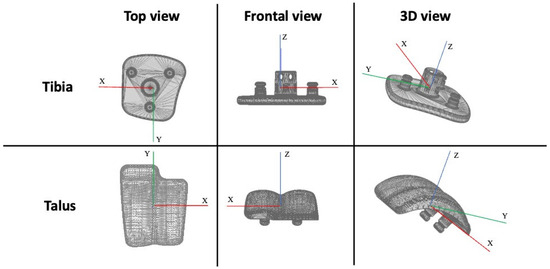 The acquisition rate was set to 8 frames per second. The movements have been described concerning the tibia in relation to the talus and polyethylene (the latter was radiotransparent and considered congruent with the talus). The reference systems are shown in Figure 2. The X axis has been used for the evaluation of the dorsi-plantarflexion angles and the medial-lateral translation, the Y axis for varo-valgus rotations and anterior-posterior translations, and the Z axis for the evaluation of internal and external rotations. The quantitative kinematic data for each patient were calculated using the Grood and Suntay decomposition [21]. According to the ISO-5725 regulation [22], the measurement accuracy of the validated MB-RSA software (MATLAB software) was 0.22 ± 0.46 mm for the model position and 0.26° ± 0.2° for the model orientation [12,20].