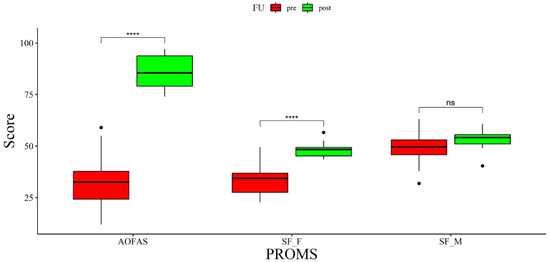 The clinical AOFAS ankle–hindfoot scores and functional (F) domain of SF-36 showed a statistically significant improvement between preoperative and postoperative assessments (p-value < 0.005). The AOFAS increased from a mean value of 33.7 ± 13.7 (range 12–59) to an average value of 85.9 ± 8.3 (range 74–97). Concerning the SF-36 score, the physical domain showed an improvement from preoperative scores of 33.3 ± 7.37 (range 22.8–49.5) to postoperative scores of 48.2 ± 3.4 (range 43.6–56.6), while the mental domain increased from 49.1 ± 7.5 (range 31.9–63.1) to 53.25 ± 4.53 (range 40.4–60.7) (Figure 4). AOFAS also showed a substantially overlapping improvement between patients undergoing arthroplasty and Achilles tendon lengthening (from 32.4 ± 14.7 preoperatively to 85.2 ± 7.9 postoperatively) and those undergoing TAA without associated procedures (from 35.2 ± 12.8 preoperatively to 86.8 ± 9.2 postoperatively).